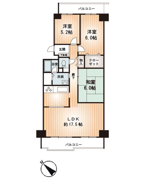 LDK17.5畳 和室6.0畳 洋室6.0畳 洋室5.2畳 |