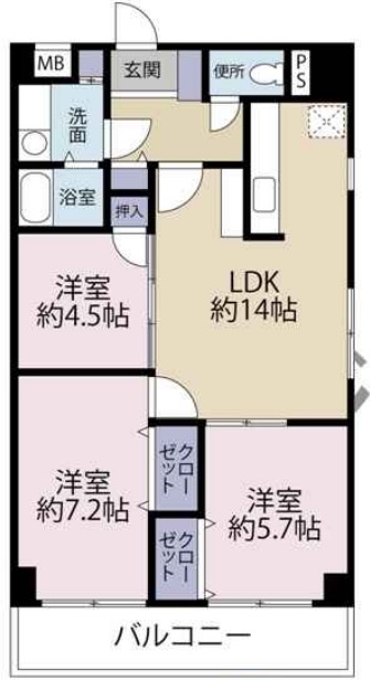 LDK14畳 洋室7.2畳 洋室5.7畳 洋室4.5畳 |