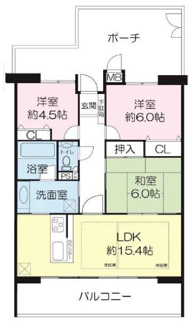 LDK15.4畳 和室6.0畳 洋室6.0畳 洋室4.5畳 |