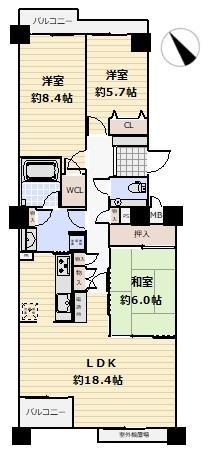 LDK18.4畳 和室6.0畳 洋室5.7畳 洋室8.4畳 |