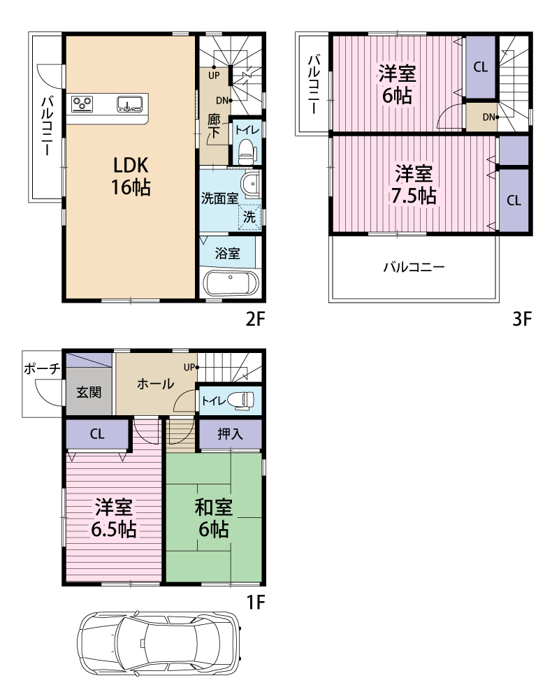 洋室6.5畳 1階 和室6畳 1階 LDK16畳 2階 洋室7.5畳 3階 洋室6畳 3階 |