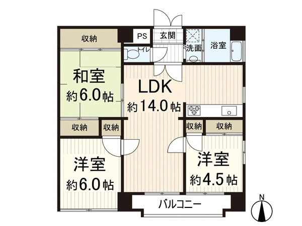 洋室6畳 和室6畳 洋室4.5畳 LDK14畳 |