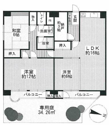 LDK16畳 洋室12畳 洋室6畳 和室6畳 S3畳 専用庭34.26㎡ |