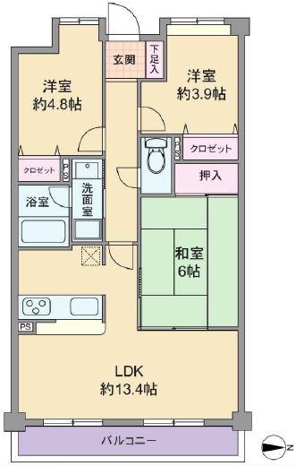 間取内容 LDK13.4畳   和室6畳   洋室3.9畳   洋室4.8畳